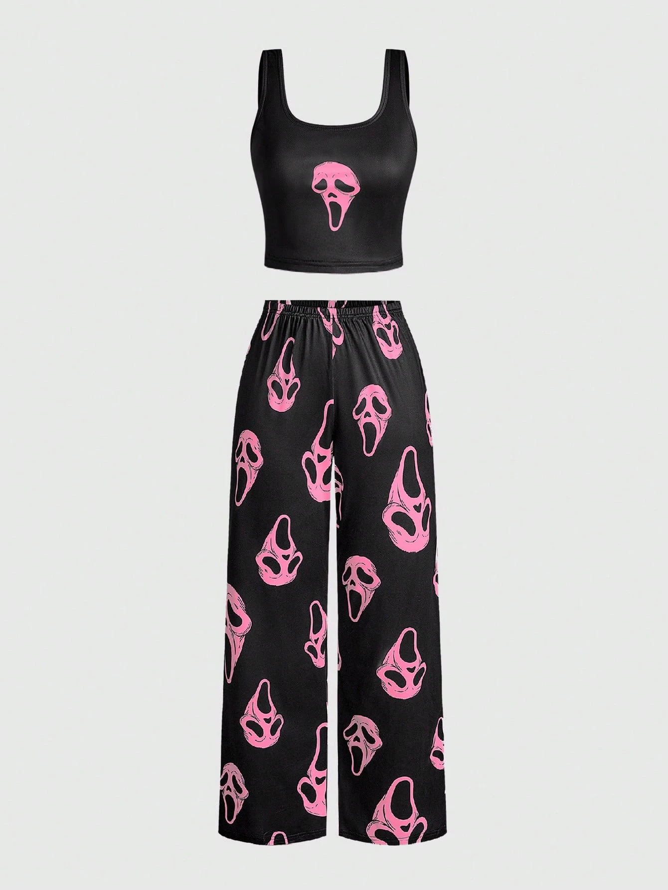 Damen Gothic Totenkopf Muster Trägerhemd und Hose Pyjama Set