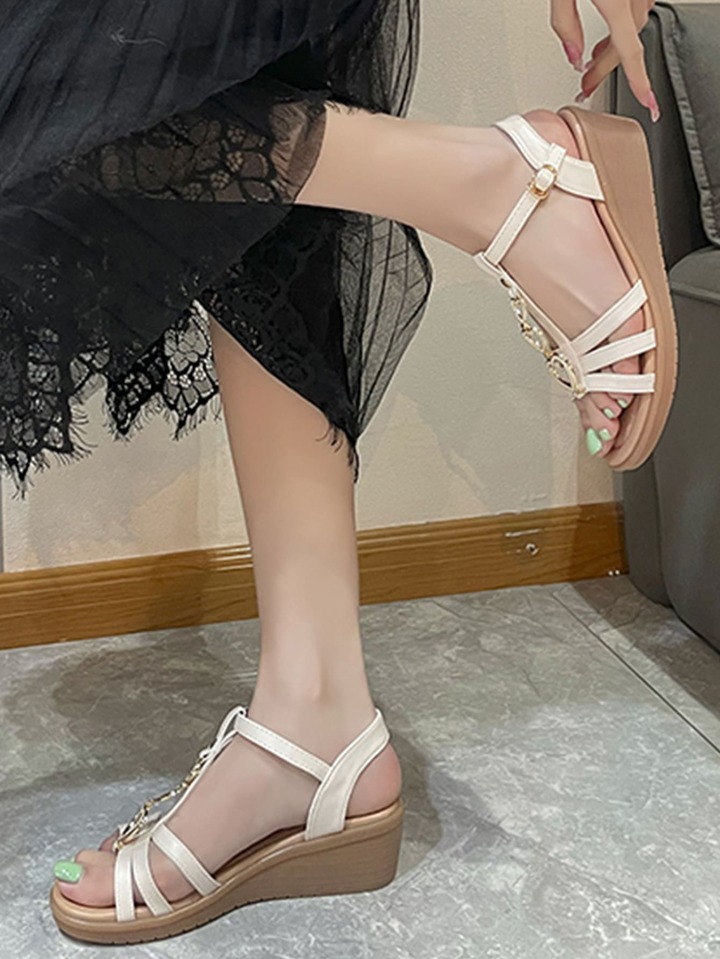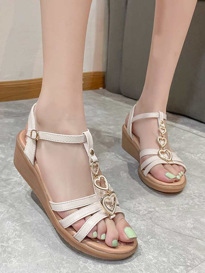 Damen-Knöchelriemensandalen mit Herzdekor, modische beige Keilsandaletten