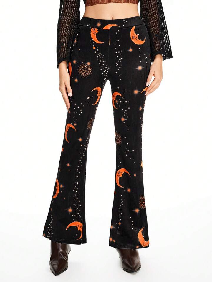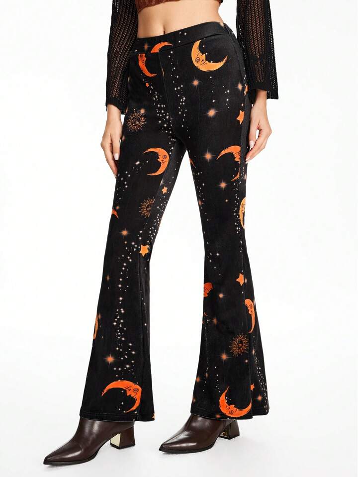 Damen Hippie Stern- und Mond-Muster Samt Schlaghose