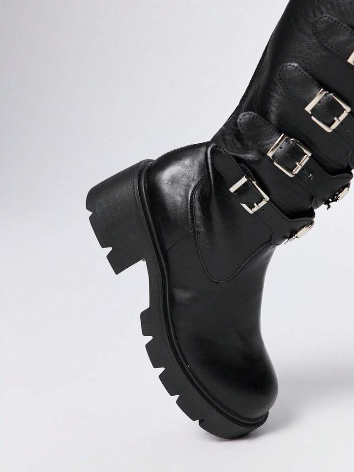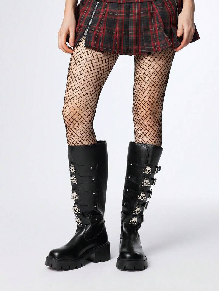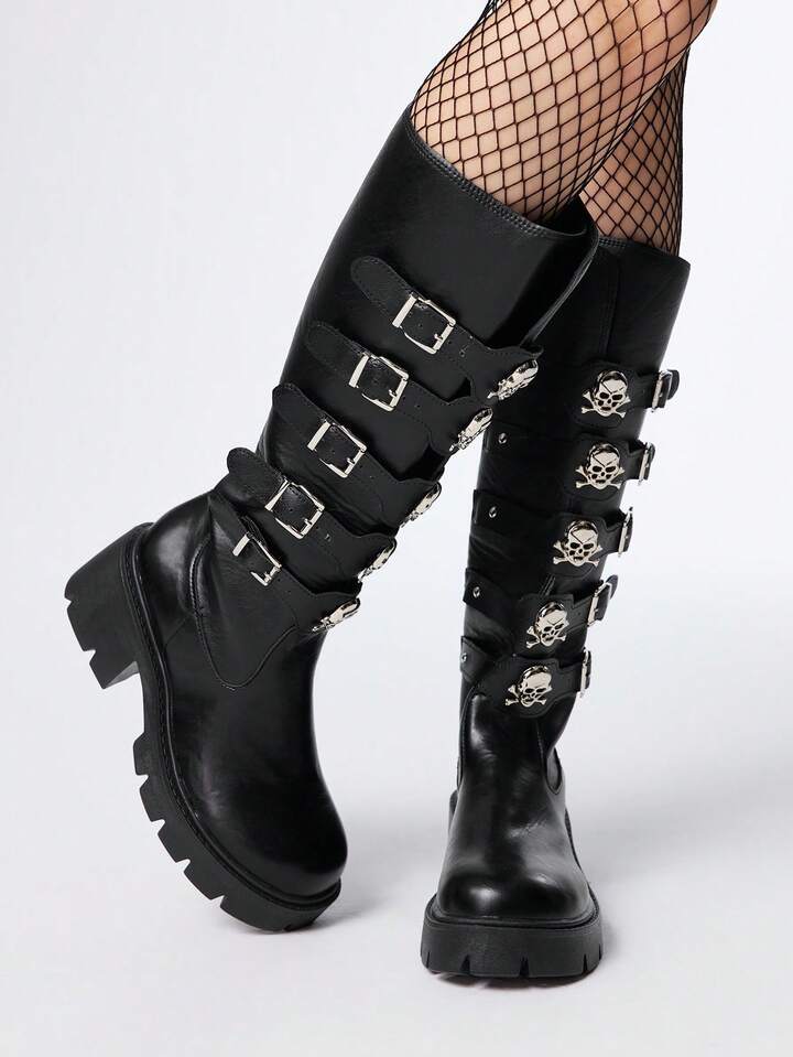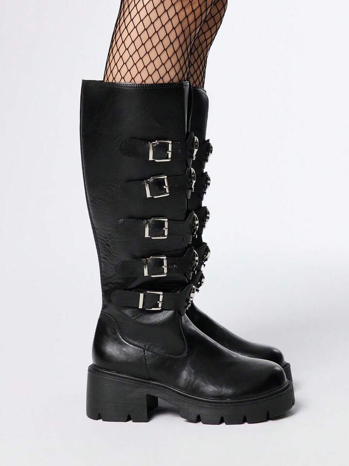 Damen schwarze geschlossene Zehe Niedrig Absatz Schnallen Motorradstiefel, Reitstiefel, Schlüpfstiefel, Leder Kleiderstiefel, Rock Punk Stiefel, Overknee Stiefel