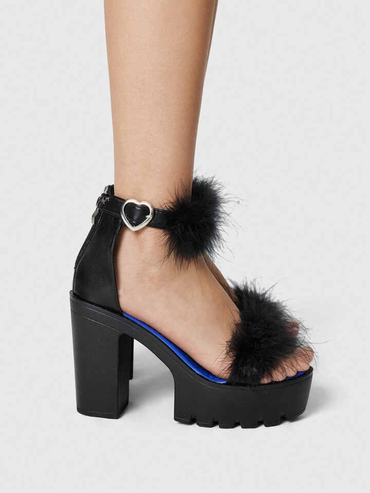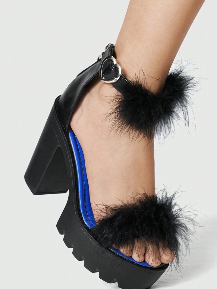Damen schwarze High Heel Sandalen, wuchtiger Kunstpelz Slingback Sandale mit offenem Zeh, sexy Gothic Punk Rock Stil Plateauschuhe