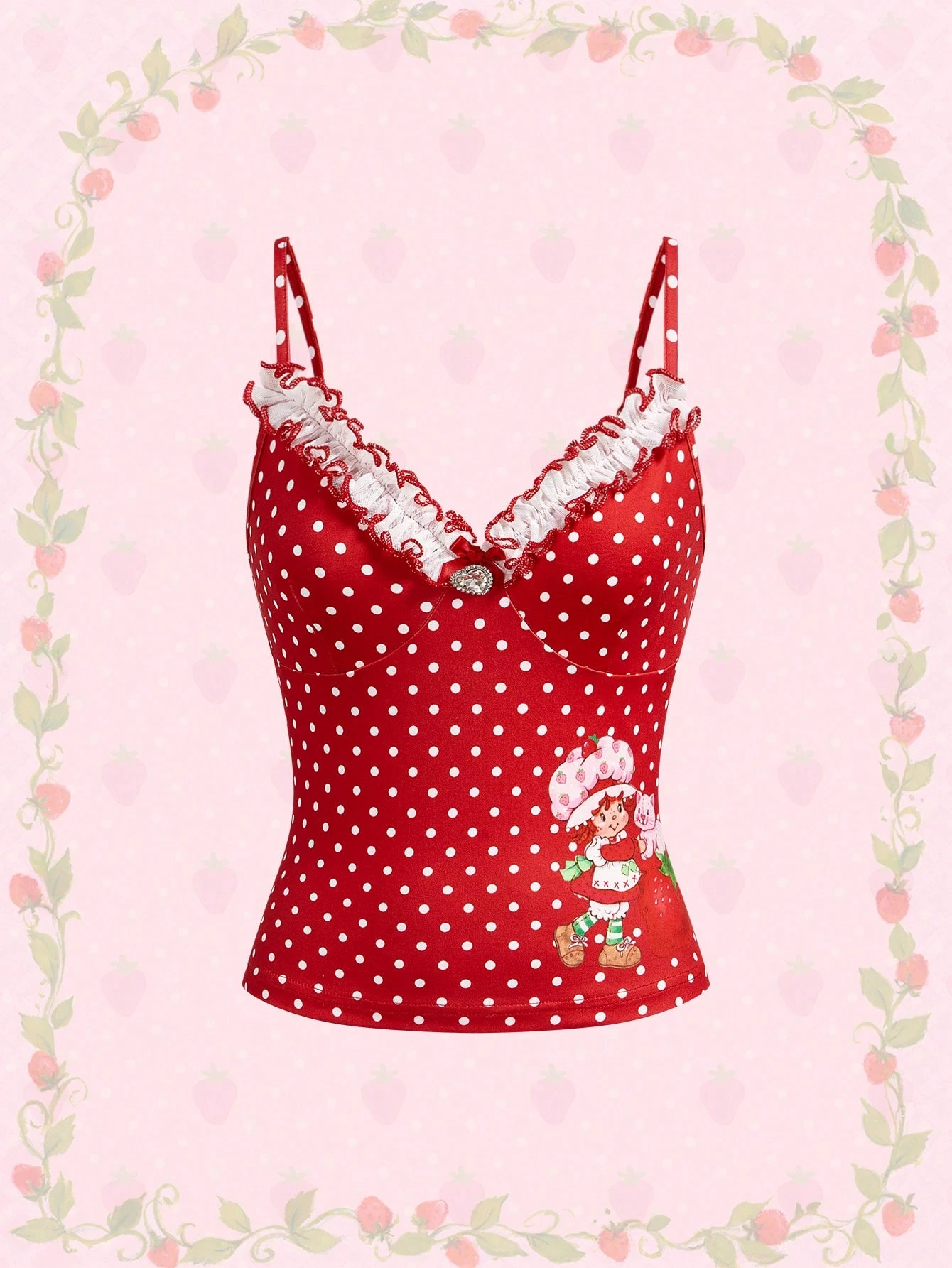 Damen Lässig Landurlaub Stil süße Cartoon Figur & Polka Punkt Muster Kontrast Volant Saum Figurbetontes Träger Top, Sommer