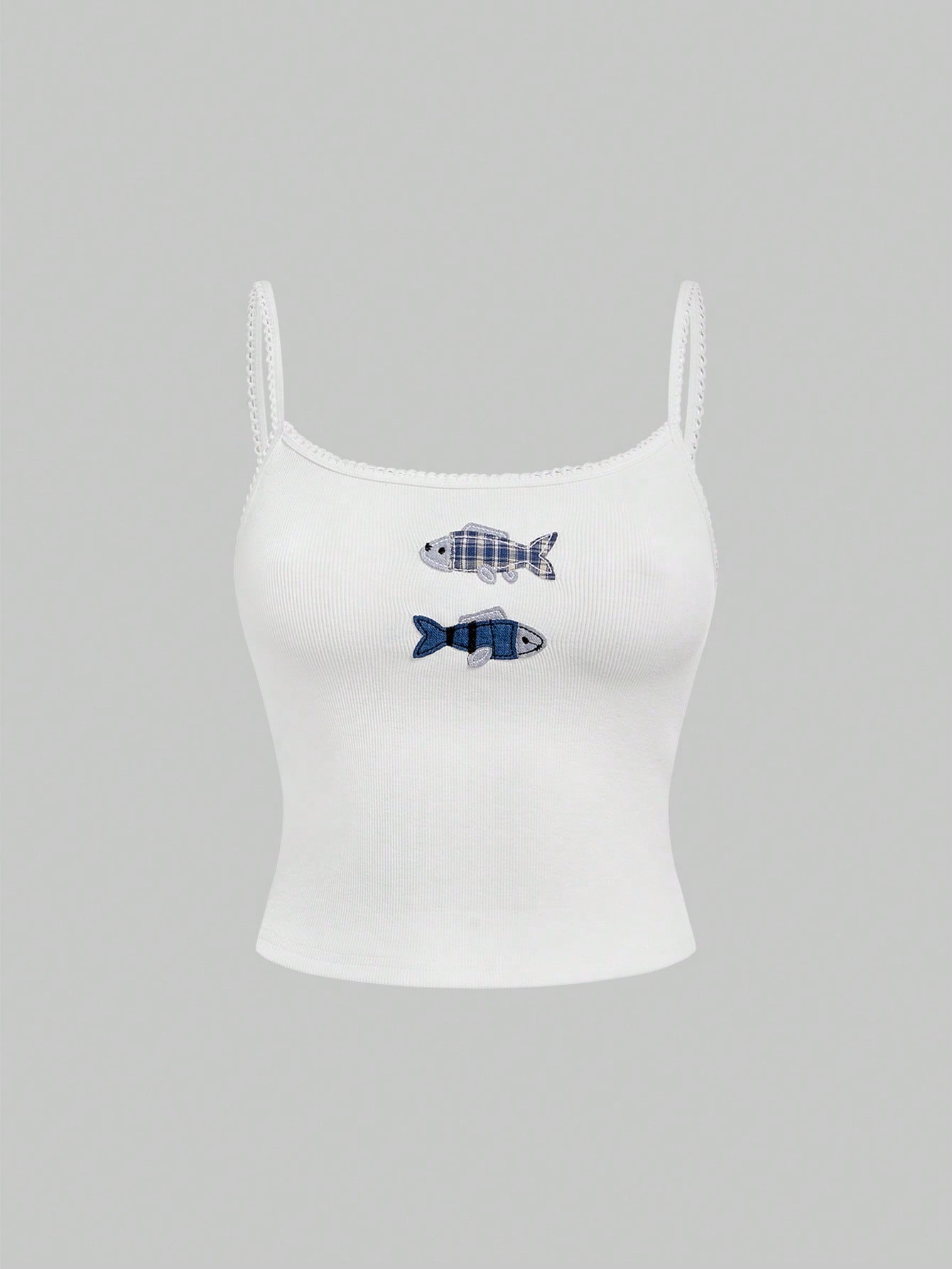 Damen Mode vielseitig Urlaub besticktes Fisch Grafik Trägerhemd Top