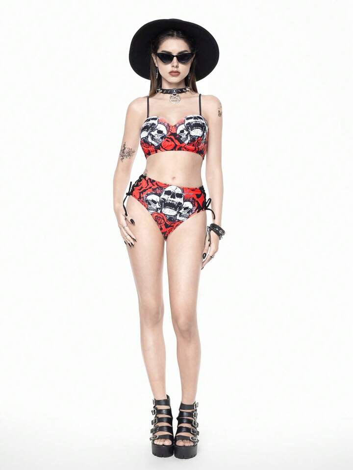 Damen Goth Rose Schädel Druckbikini Bademode Set, abnehmbare Träger, geformte Cups, seitliches Kreuzband, Sommer Strand Urlaub