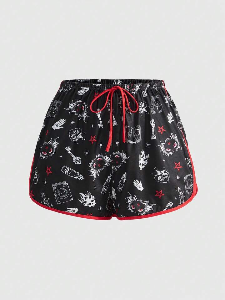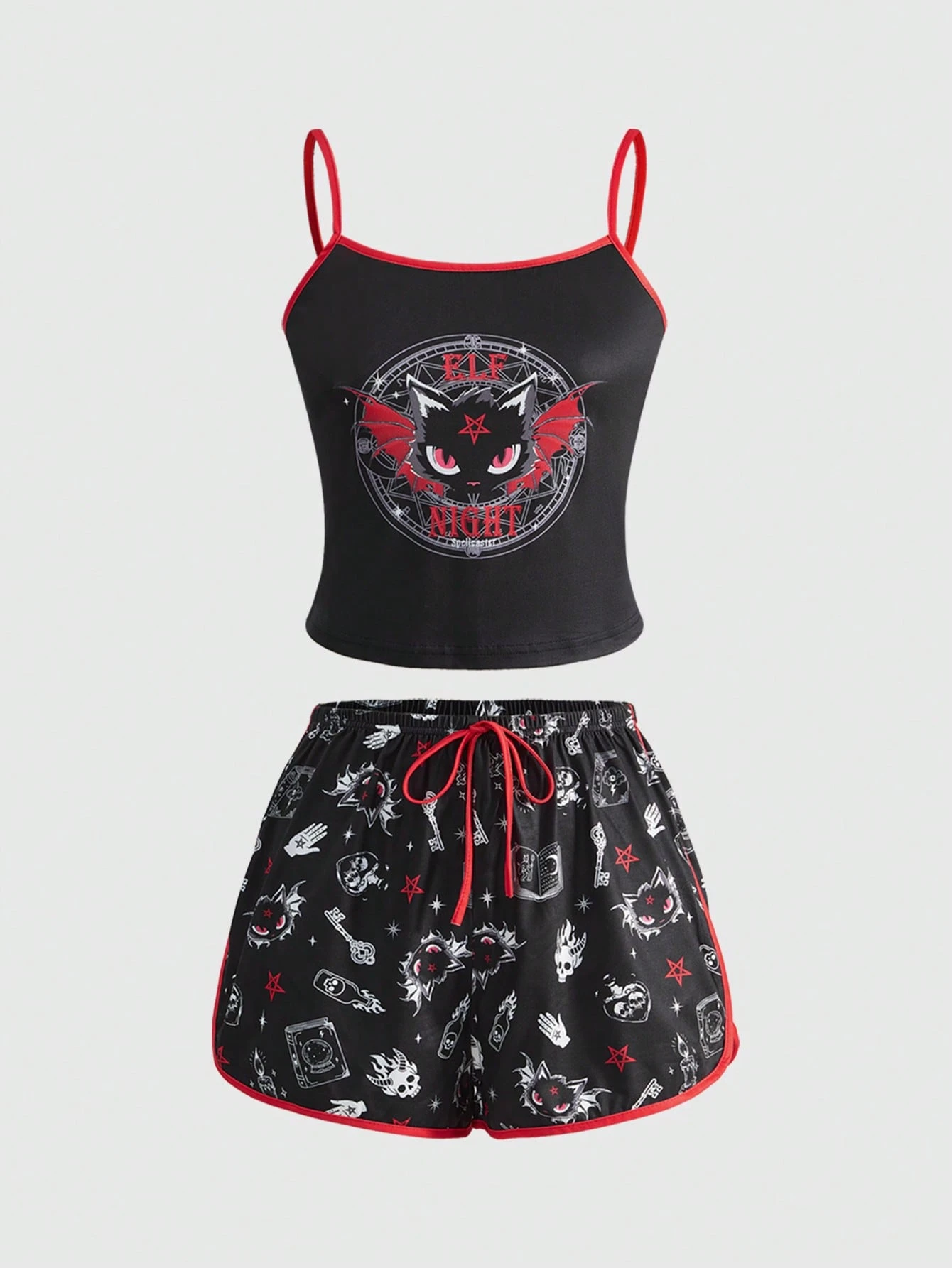 Damen Gothic Dämon Katze Sternenhimmel Magie Buch Skelett Schlüssel Stern Kontrast Saum Pyjama Set