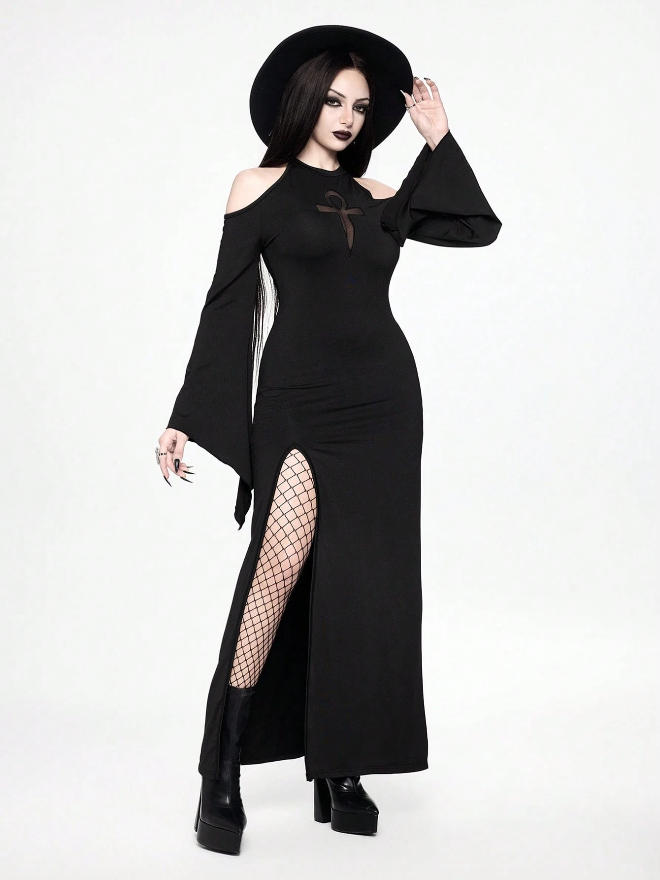Damen Gothic Weite Ärmel Hoher Schlitz Kreuz Hohlschnitt Stickerei Kleid