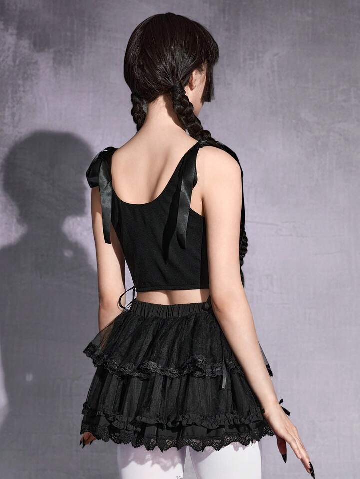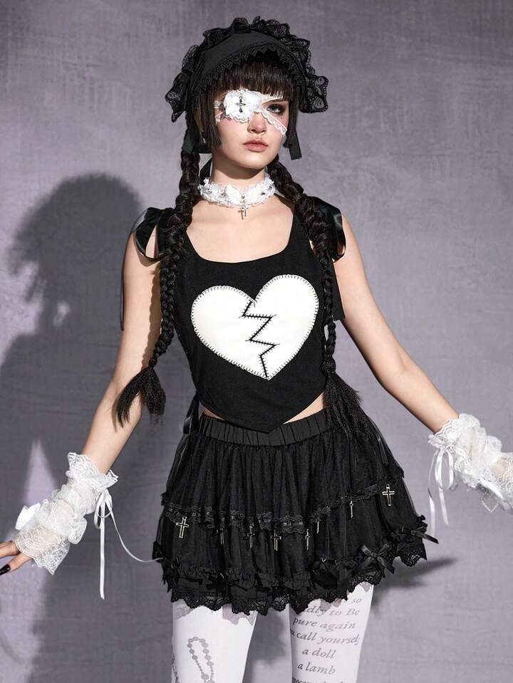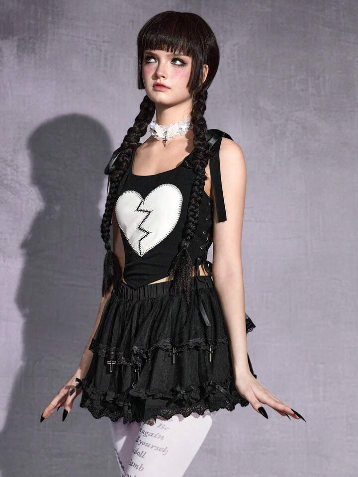 Damen Gothic Herz Stickerei Schleife Schulter Slim Crop Camisole