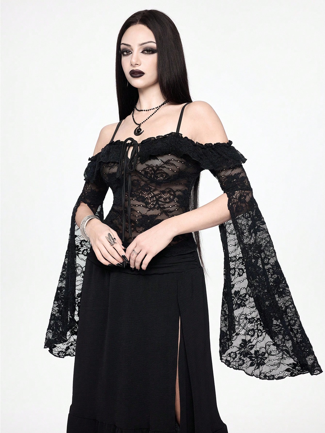 Damen Gothic Spitze transparente Off-Shoulder Trompetenärmel Bluse