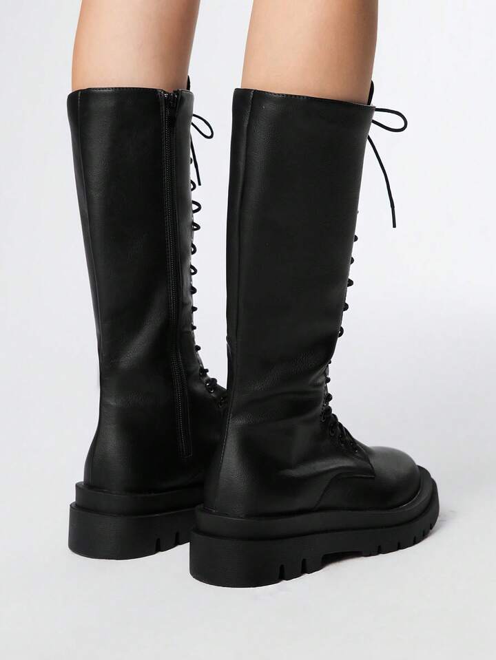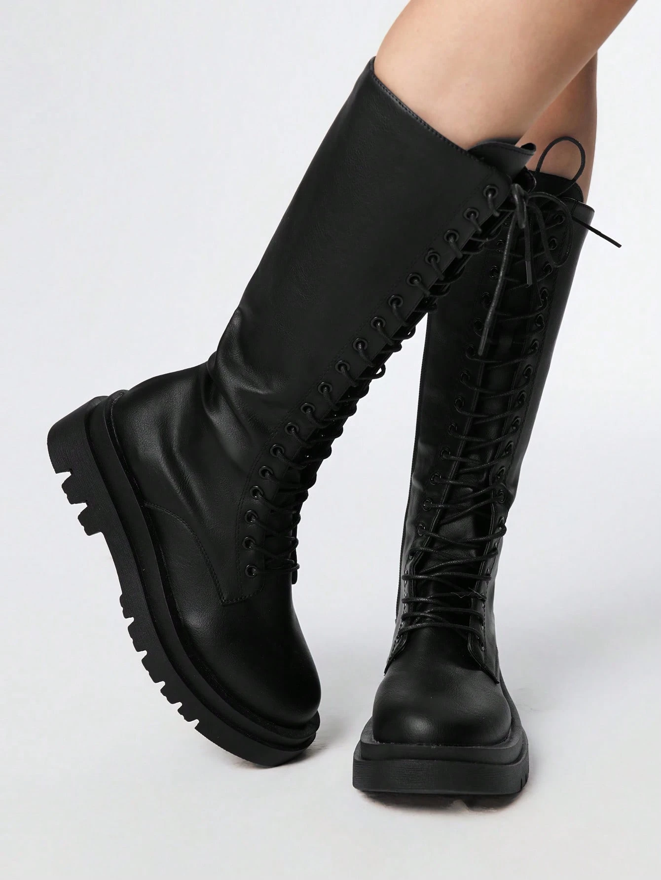 Damen Kniehohe Stiefel mit modischem Schnürung, dicker Sohle und Plateauabsatz