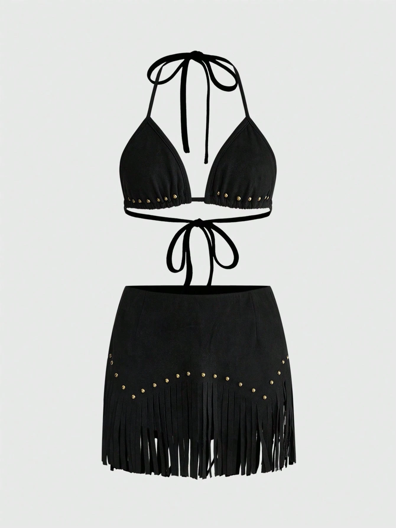 Damen Retro Musik Festival Hippie Urlaubsstil Wildleder Stoff Nieten Dekor Fransen Saum Bikini Shorts 2-teiliges Set