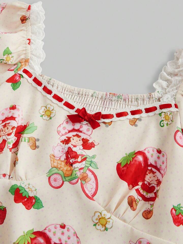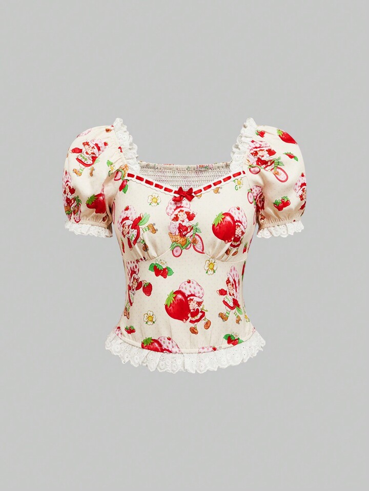 Damen Bluse mit Puffärmeln und Allover Erdbeermuster