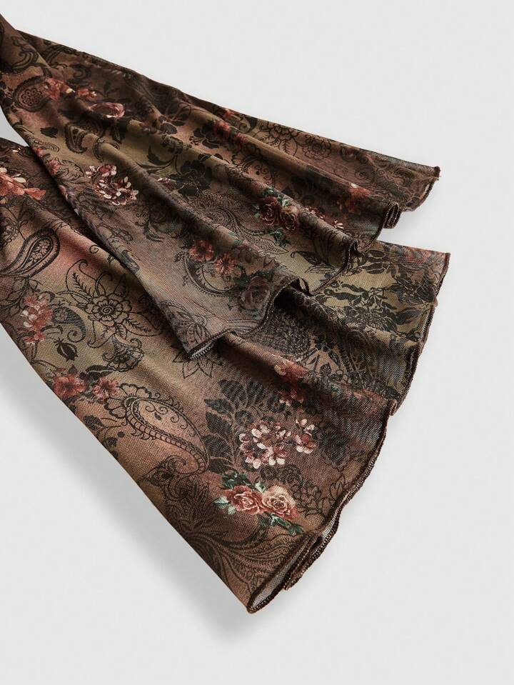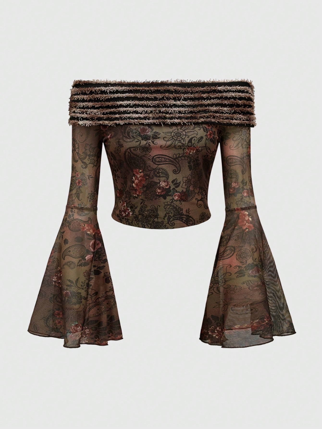 Damen Vintage Y2K Hippie Stil Off-Shoulder Bluse mit strukturiertem Patchwork Stoff, Paisley und Blumen Muster, weite Ärmel