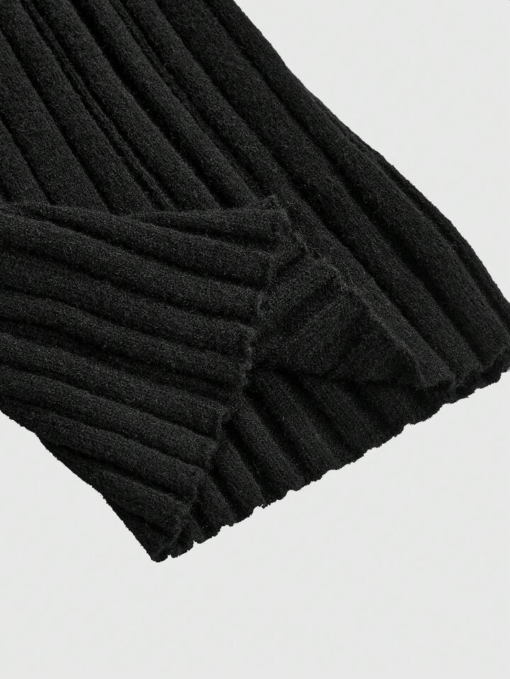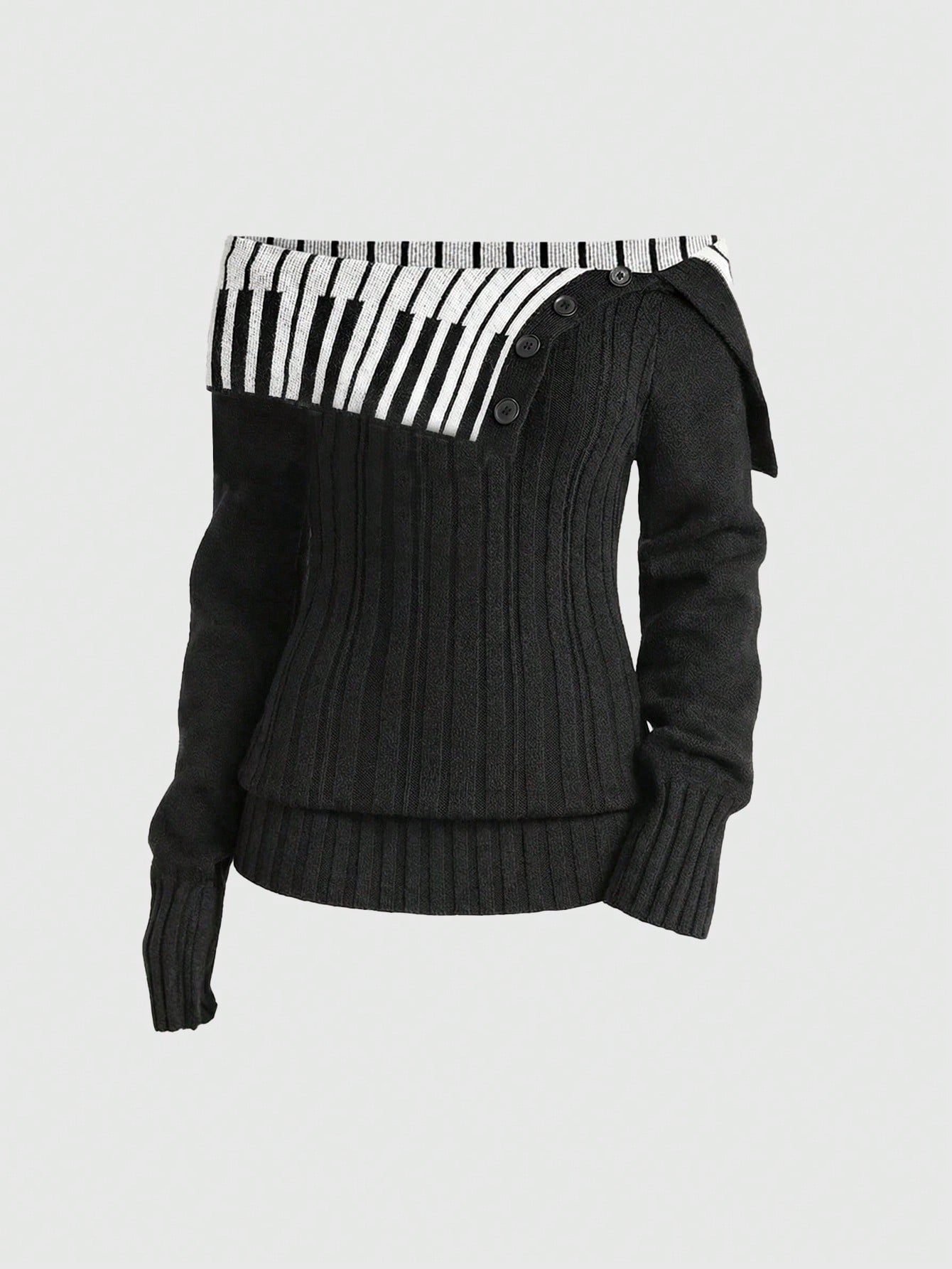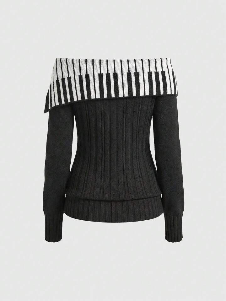 Damen Y2K Girly Purity One-Shoulder Piano Jacquard Muster Umlegekragen Taillengürtel Zopfstrick Pullover
