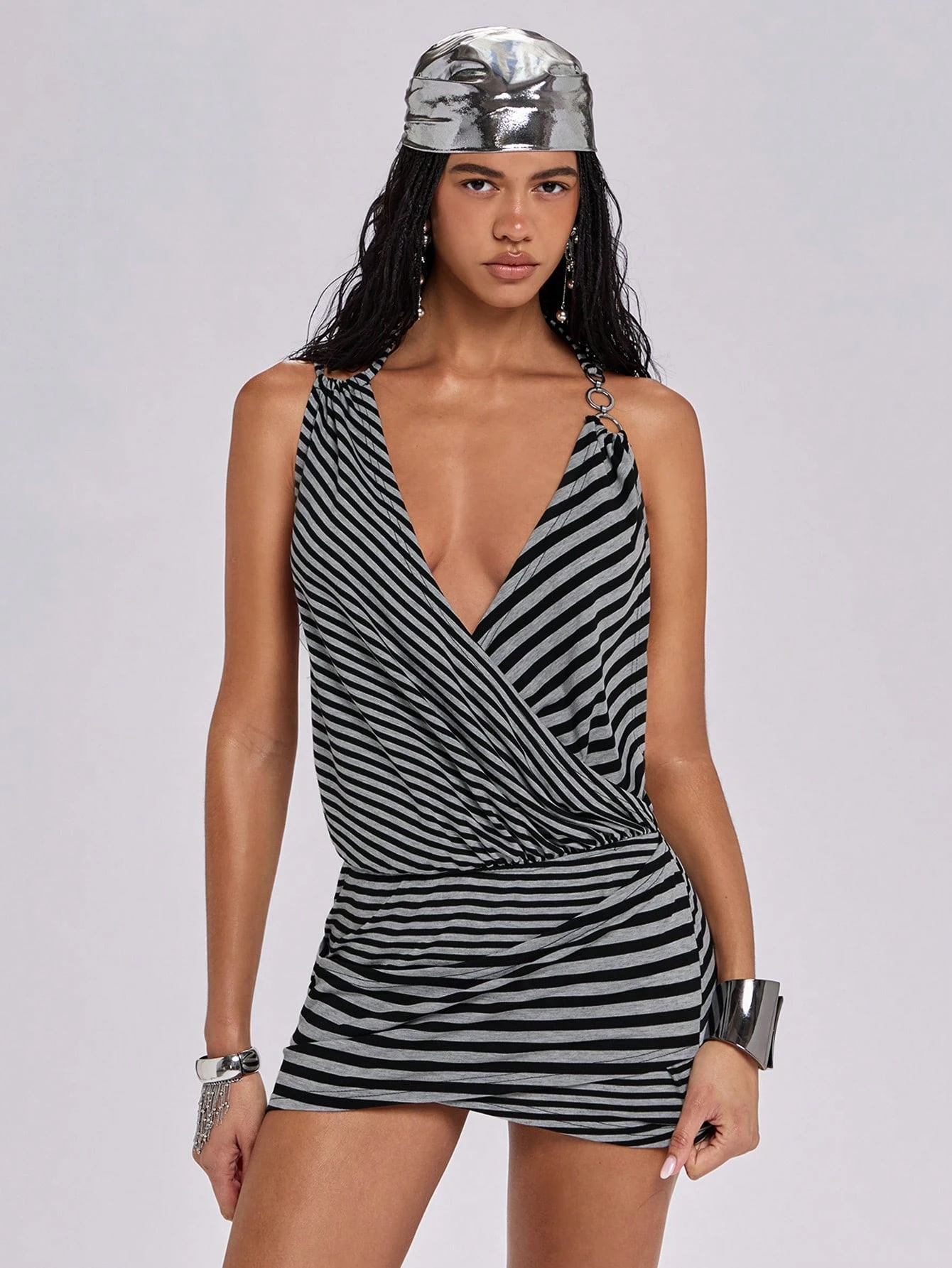 Y2K Baddie Party Musik Festival Outfit, grau & schwarz gestreiftes tief ausgeschnittenes Taillen-Taschen Bodycon Minikleid
