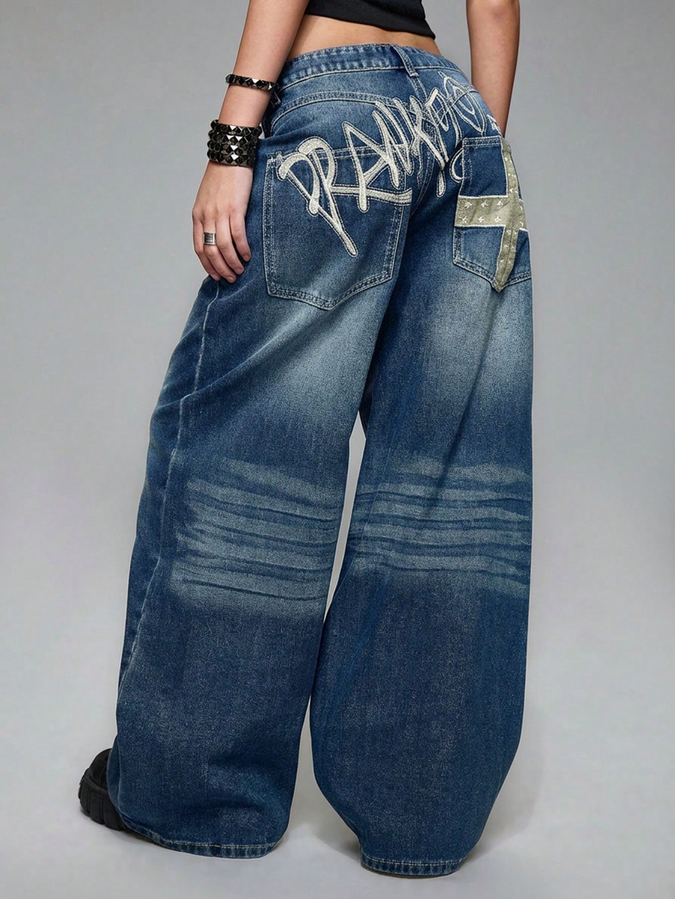 Grunge Punk Y2K Chic Buchstaben- & Kreuz-Stickerei Destroyed Loose Fit Taillenbund Weite Bein Damen Jeans