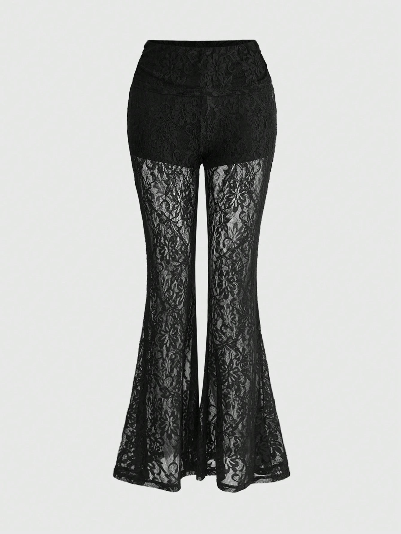 Y2K Stil sexy Spitze Schlaghose, hochtaillierte dehnbare transparente Hose für Frauen, Frühling/Sommer
