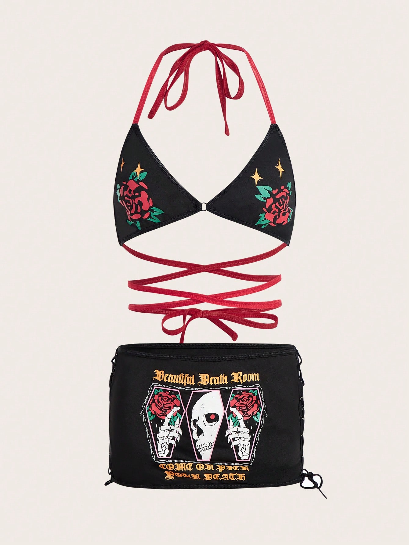 lockdsg Dessous Set mit Schädel & Blume Grafik,
