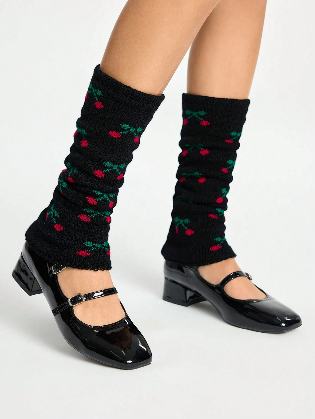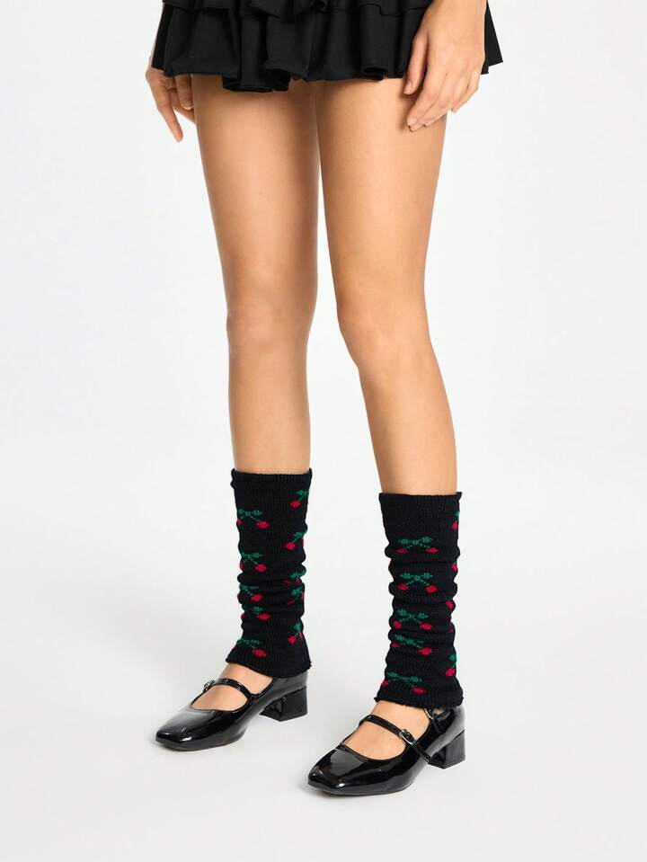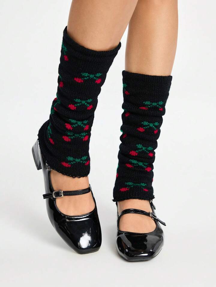 1 par de calentadores de piernas blancos con lindo y kawaii patrón de cerezas