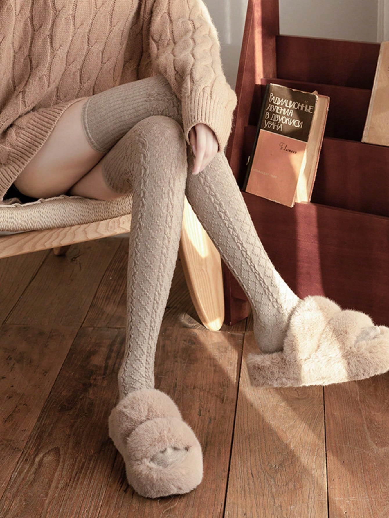 1 Par Calcetines Sólidos Con Patrón De Torcedura Sobre La Rodilla