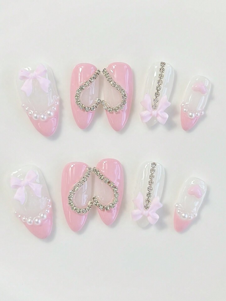 10 piezas de uñas postizas con lazos hechos a mano de alta calidad + 3 láminas de adhesivo doble cara, pegatinas de uñas con corazones de strass, lazos desmontables y diseño de corazón, adecuado para fiestas, baile y uso diario de uñas postizas