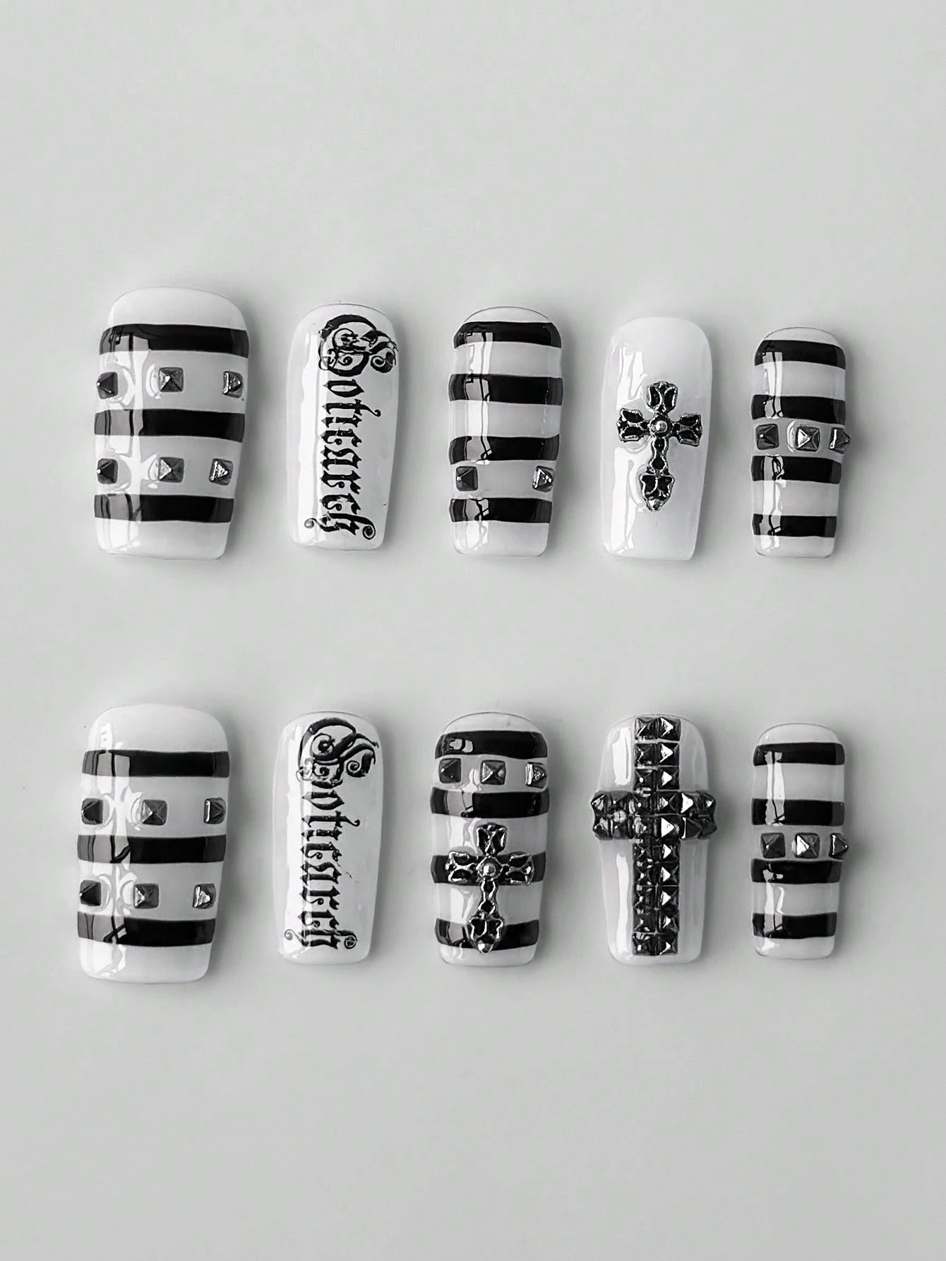10 piezas de uñas postizas de estilo punk con remaches en forma de cruz + 3 piezas de cinta adhesiva de doble cara, patrón de letras en blanco y negro estilo Y2K, elemento de patrón geométrico para manicura, uñas postizas cuadradas medianas desmontables estilo Y2K, manicura reutilizable para todas las estaciones, adecuado para uso diario y citas