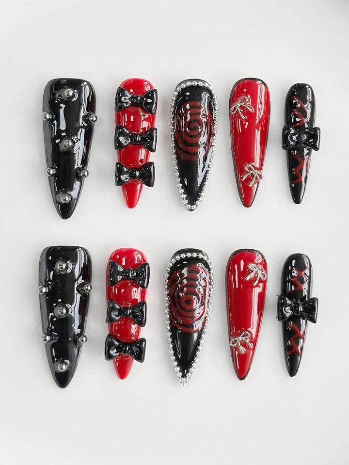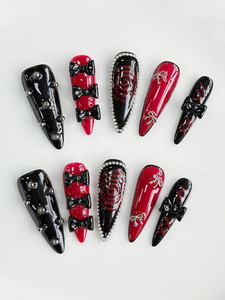 Goth 10 piezas uñas postizas hechas a mano de alta calidad con lazos oscuros de estilo + 3 piezas adhesivas de doble cara, decoración de uñas góticas Y2K, removibles, con pegamento, calcomanías de uñas pintadas a mano, adecuadas para fiestas, baile y uso diario