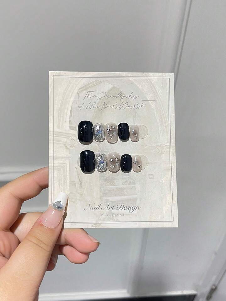 10 piezas corto cuadrado con diseño de diamante de imitación Uña postiza & 1 hoja cinta