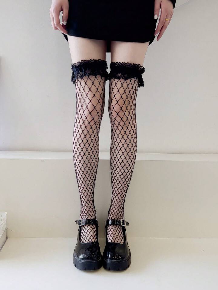 Mujer 1 par Calcetines de malla con encaje en contraste ribete con fruncido sobre rodilla