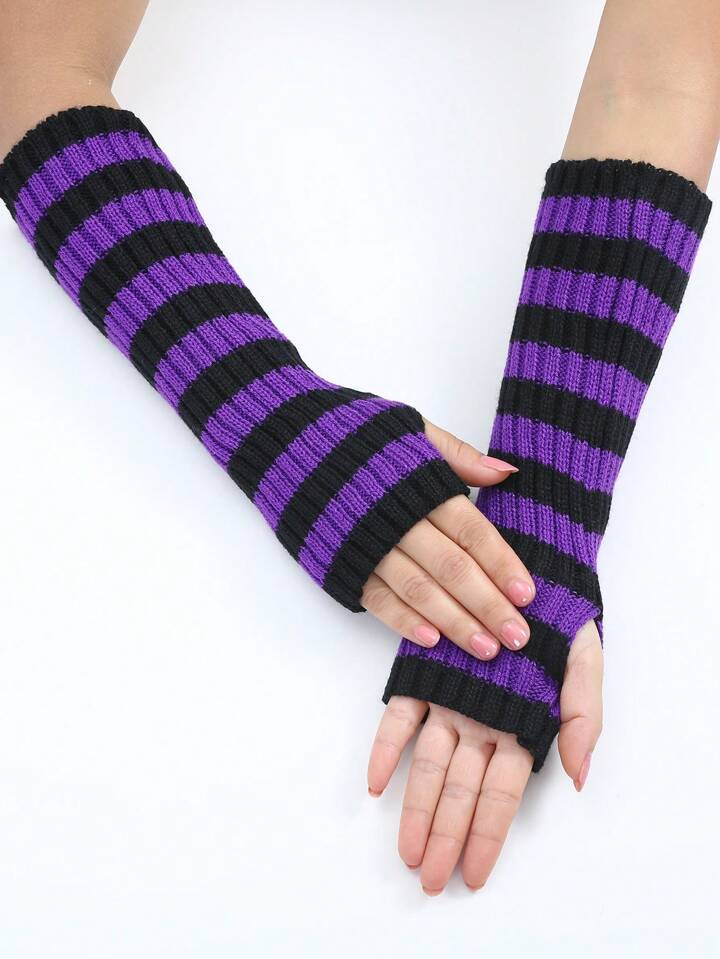 1 Par De Guantes De Punto A Rayas Y Morados Para Mujer, Mitones Con Diseño Sin Dedos, Largos Y Calentadores De Brazos Tejidos, Otoño E Invierno
