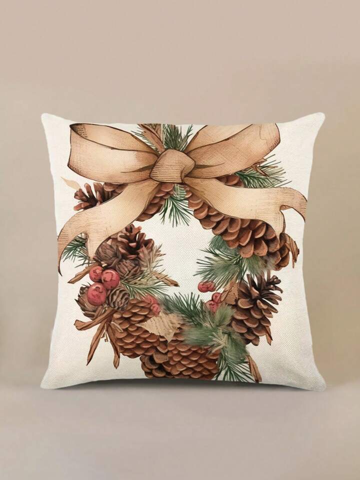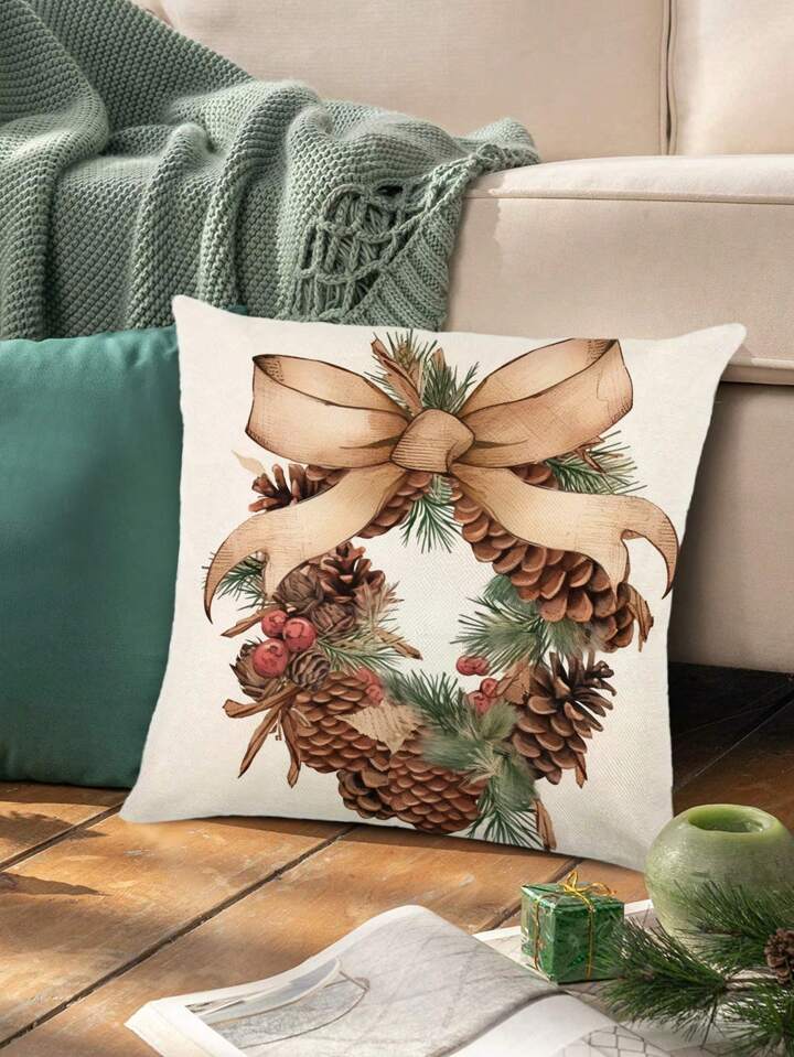 1 Pieza Funda De Almohada De Lino Con Diseño De Piñas Navideñas Y Corona Sin Interior, 45cm X 45cm/17.7in X 17.7in Cuadrada Con Cierre De Cremallera, Suave Y Cómoda Funda De Almohada Decorativa Estampada De Un Solo Lado Para Las Fiestas, Adecuada Para El Día De Navidad