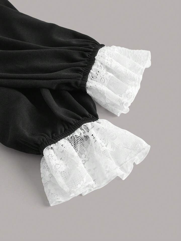 1 pieza Top con encaje en contraste con lazo delantero de manga amplia de cuello alto