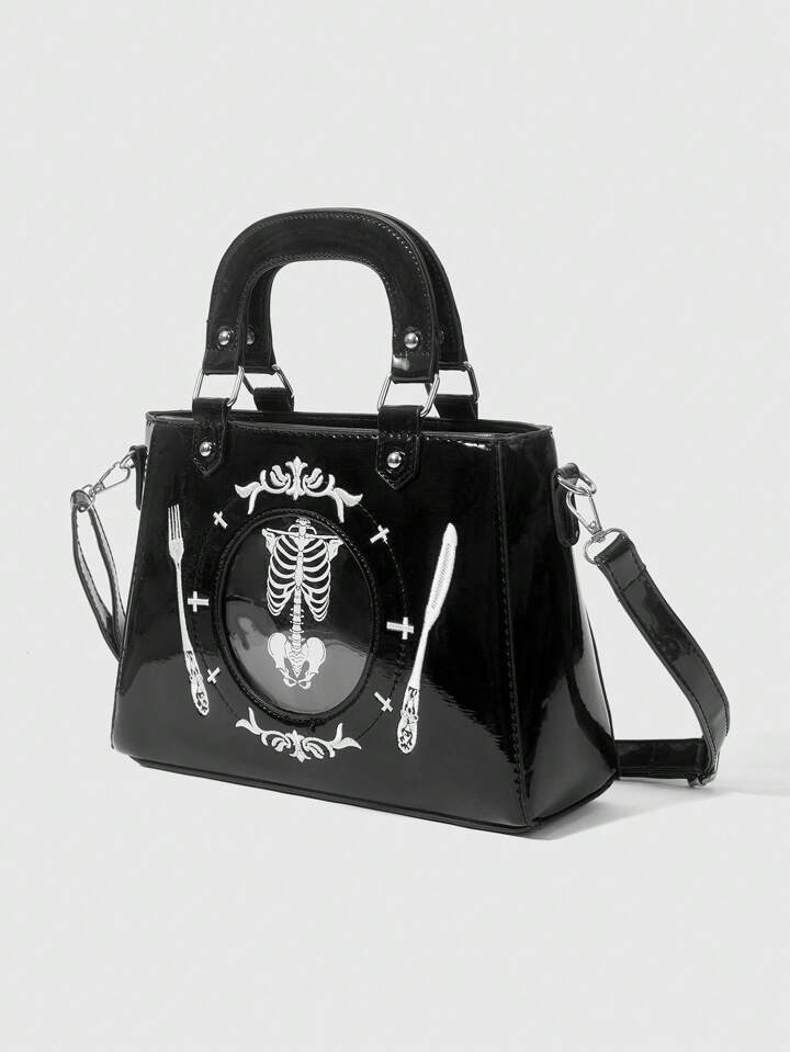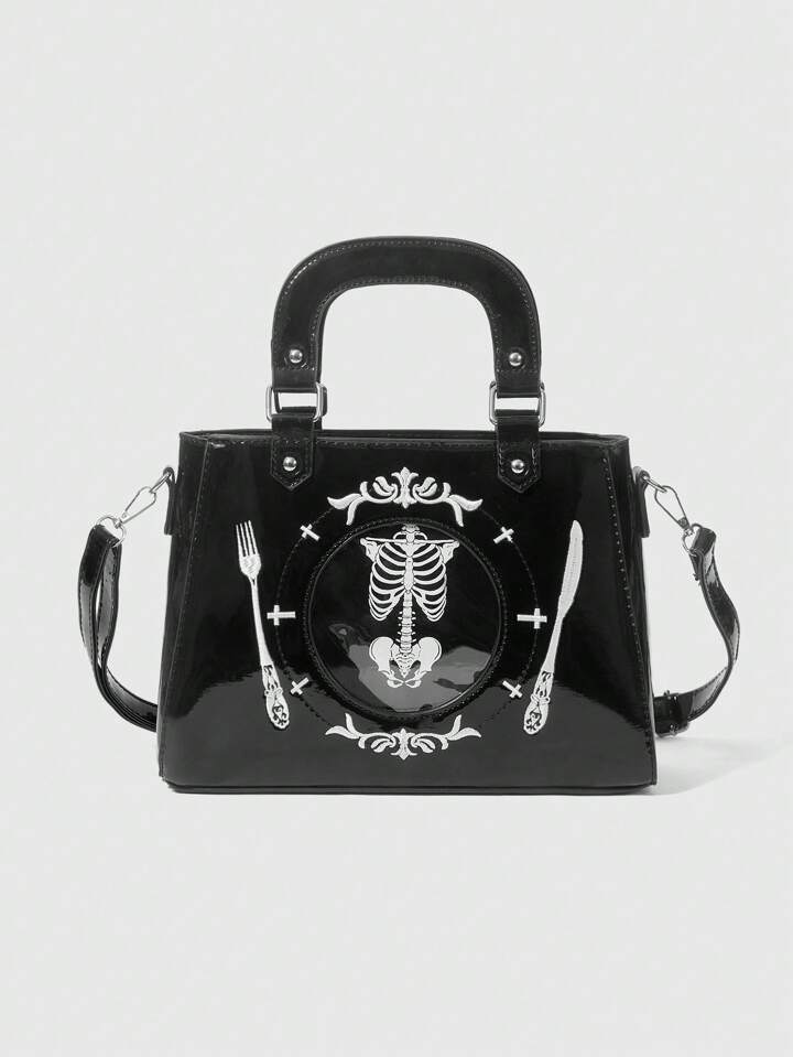 1 pieza Bolso de hombro tipo bandolera con forma de plato para cena, con bordado de calavera gótica estilo goth