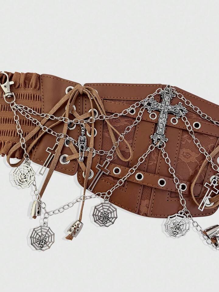 Goth 1 pieza Accesorio de vestido con cinturón de cintura estilo gótico oscuro de estilo esqueletón con cadena de encaje marrón para disfraz de Halloween