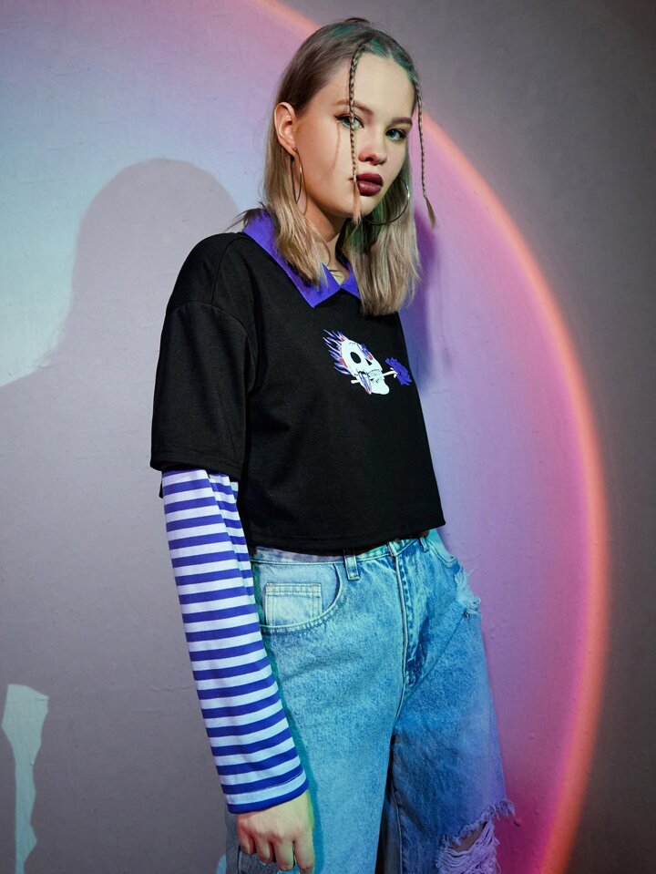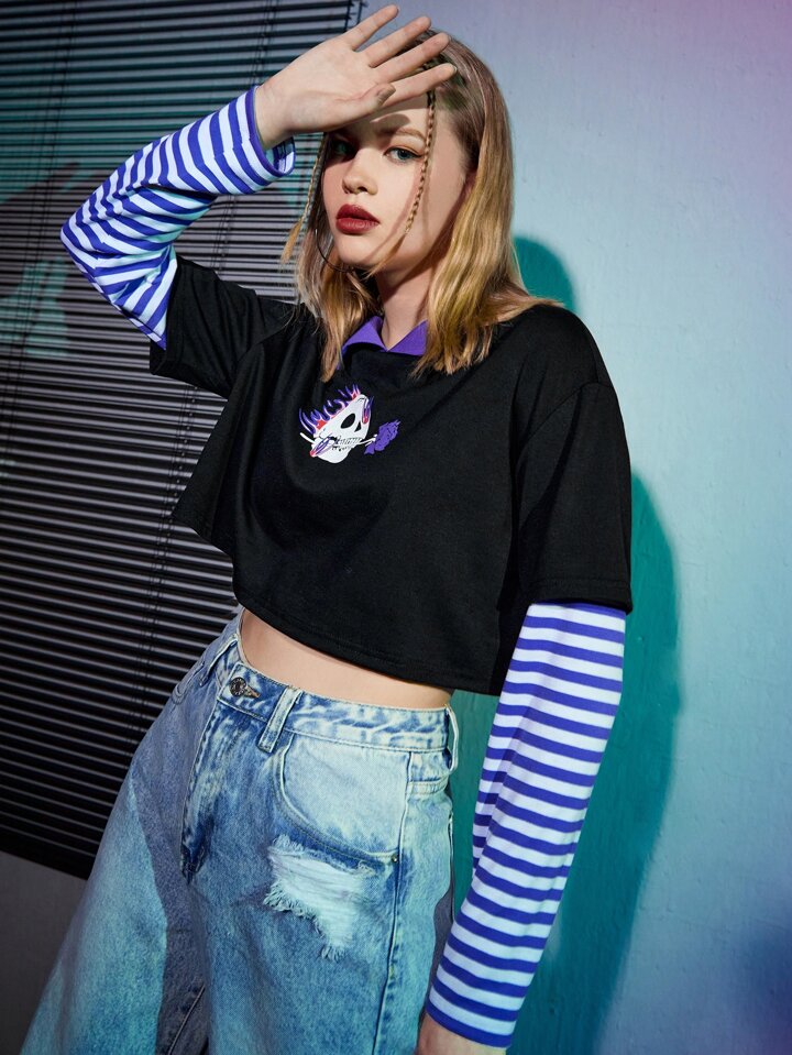 Camiseta 2 en 1 manga de rayas con estampado de cráneo