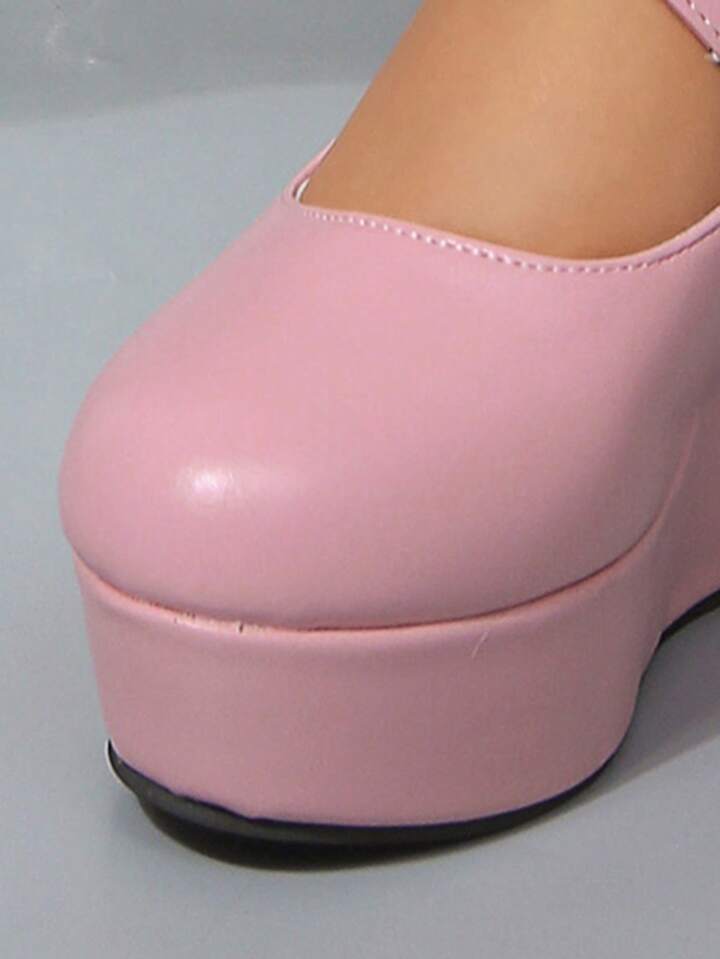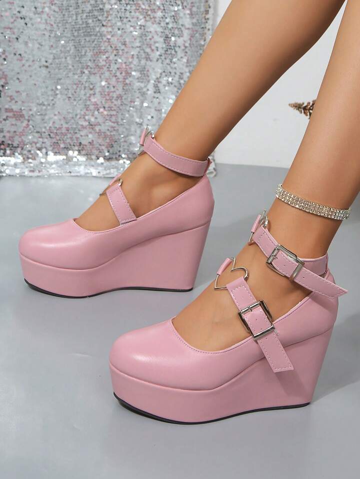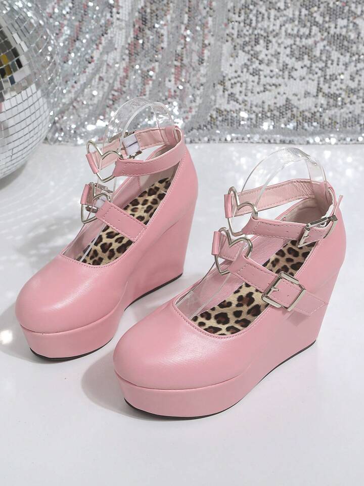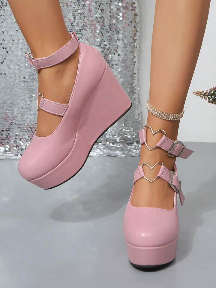 Nuevo para la primavera/otoño 2024: Zapatos kawaii rosados Mary Jane de tacón grueso y plataforma con correa de hebilla de corazón