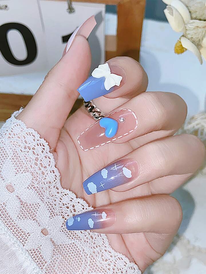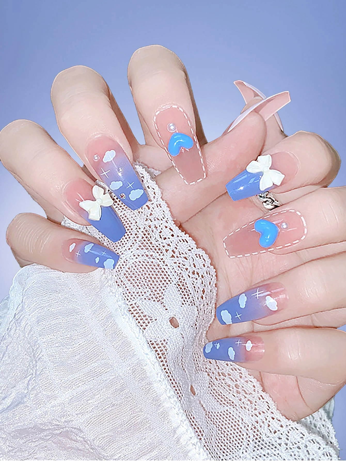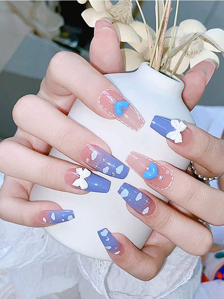 24 piezas Uña postiza largo ataúd con patrón de corazón