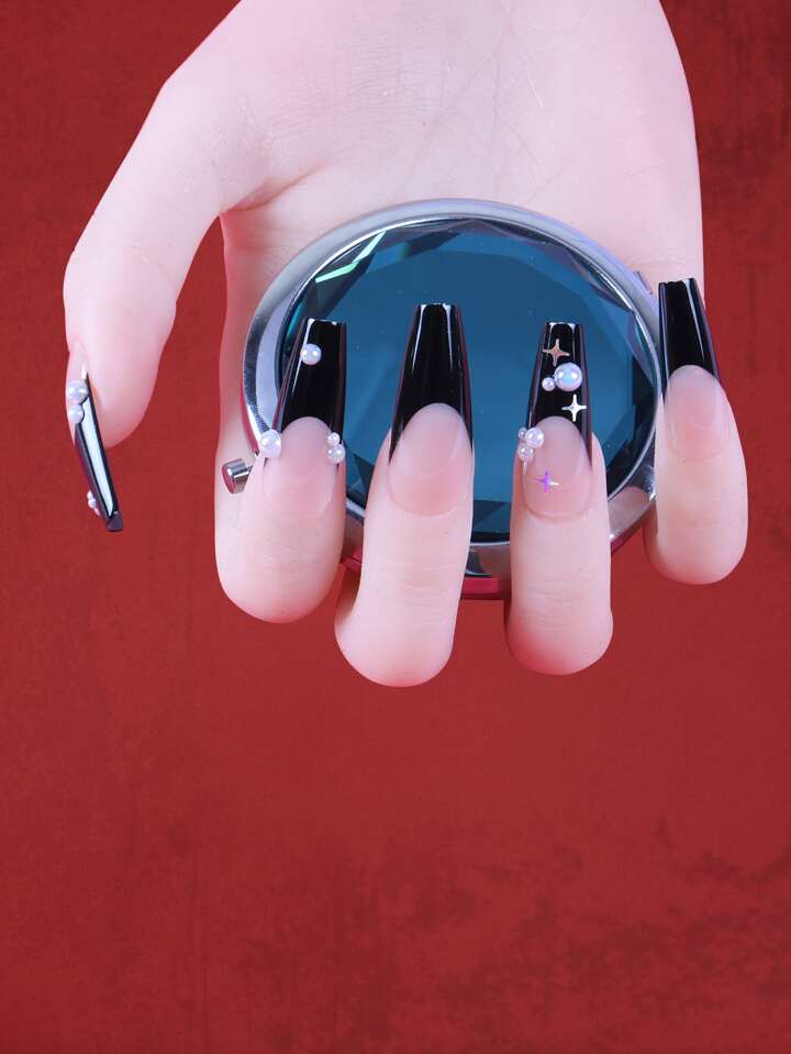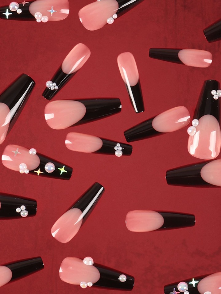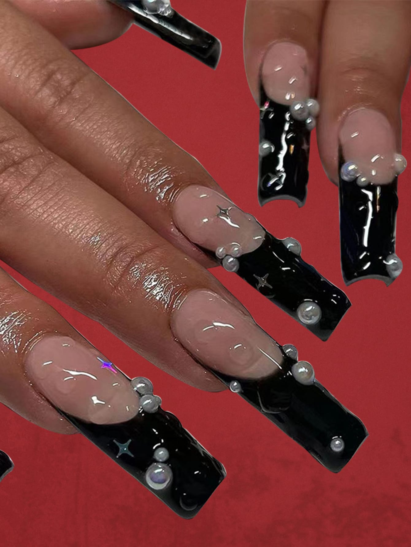 24 piezas largo cuadrado con diseño de perla artificial Uña postiza & 1 hoja cinta