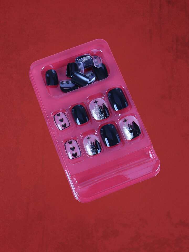 24 piezas Uña postiza largo cuadrado con patrón de corazón & 1 hoja cinta