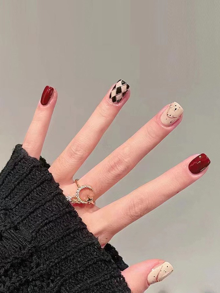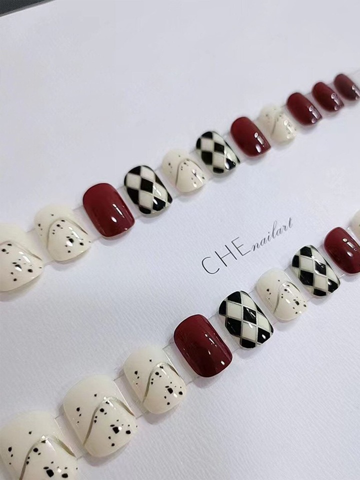 24 piezas Uña postiza corto cuadrado con patrón de cuadros & 1 hoja de cinta para uñas