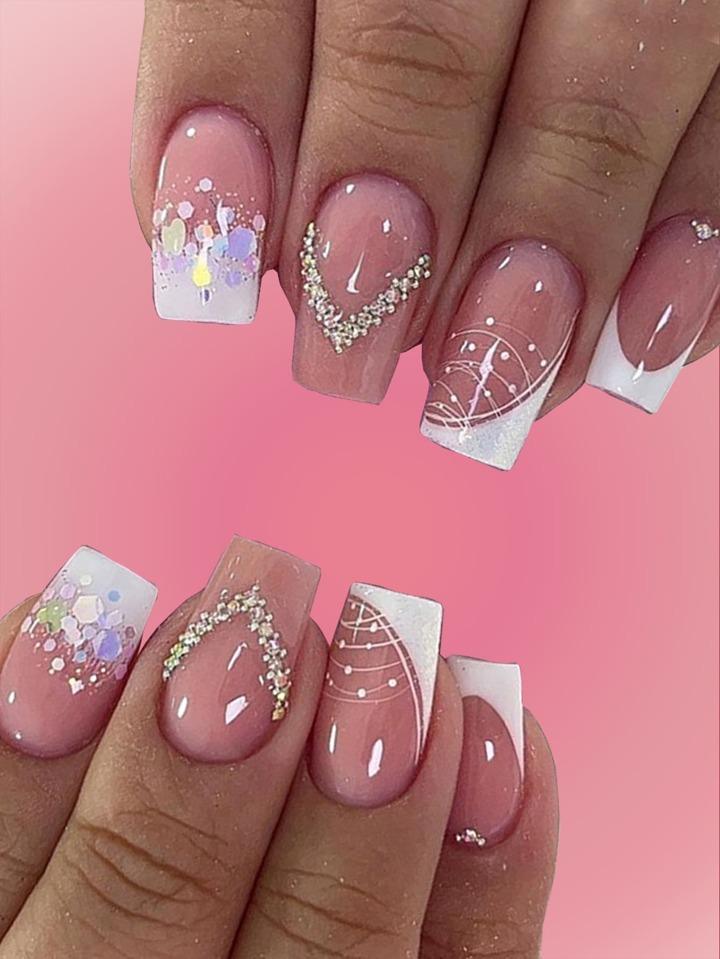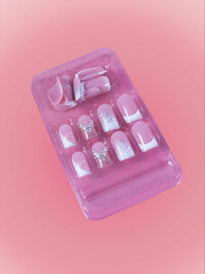 24 piezas corto cuadrado con lentejuelas de cuadros Uña postiza & 1 hoja cinta