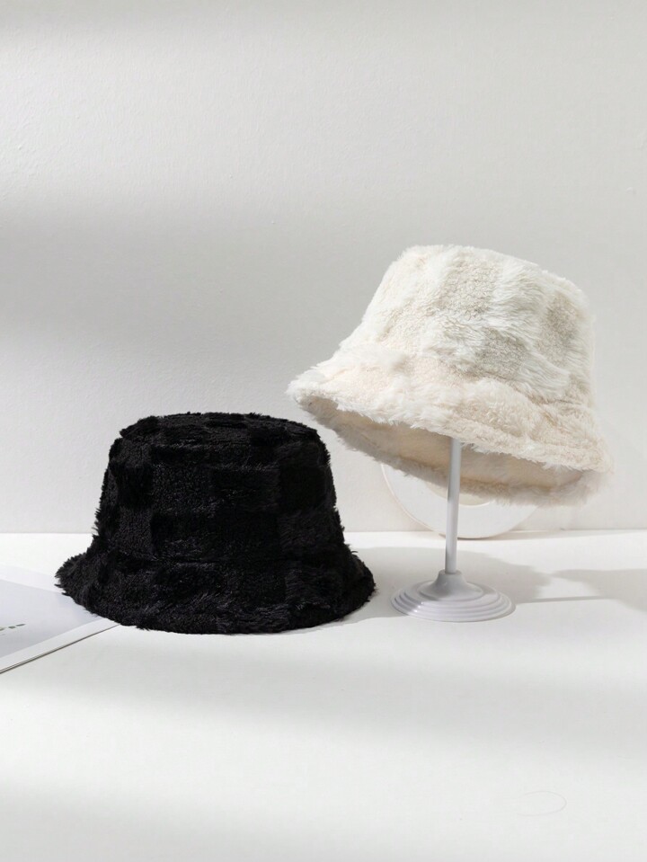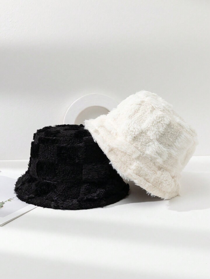 2 piezas/set Sombrero de cubo de franela a cuadros blanco y negro para mujer, peludo, engrosado y caliente, adecuado para uso diario