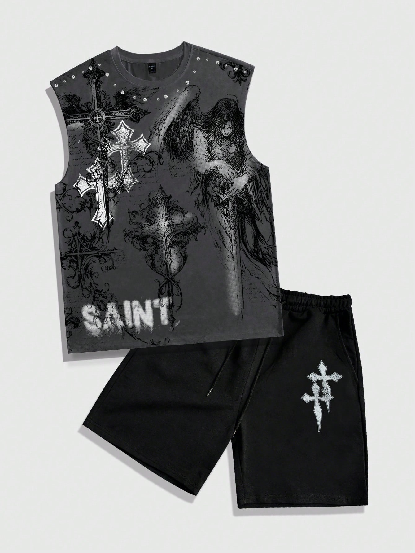 Set de 2 piezas de top de tirantes y pantalones cortos casuales con estilo Y2K para hombres, nueva colección /verano 2026