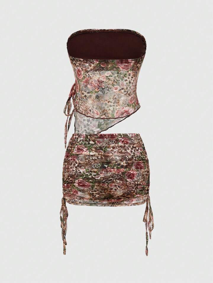 Set de 2 piezas con top corto tipo bustier con estampado de encaje y falda mini ajustado con cordón lateral, estilo hippie para mujer