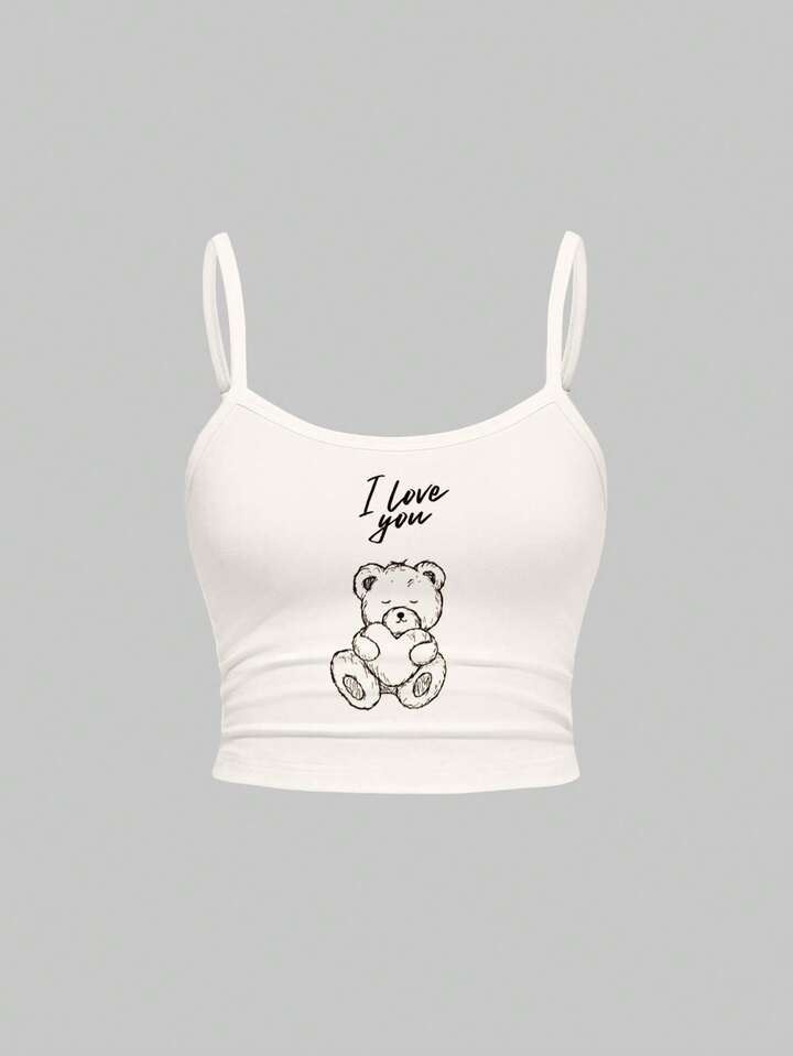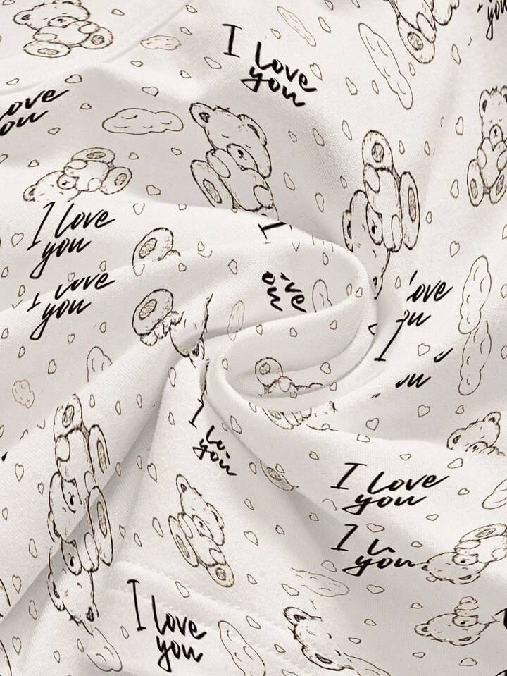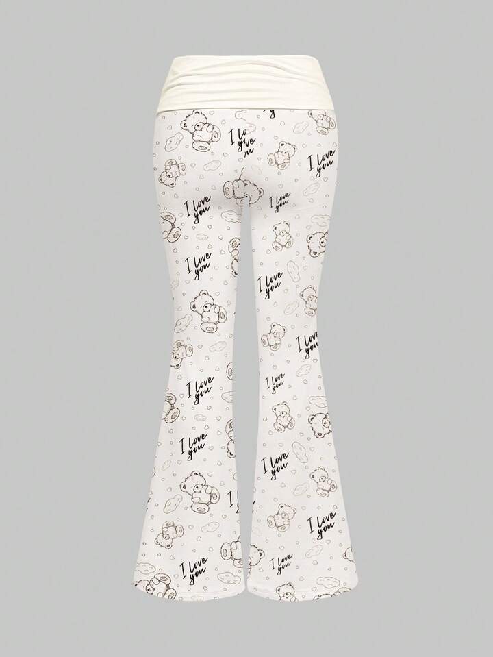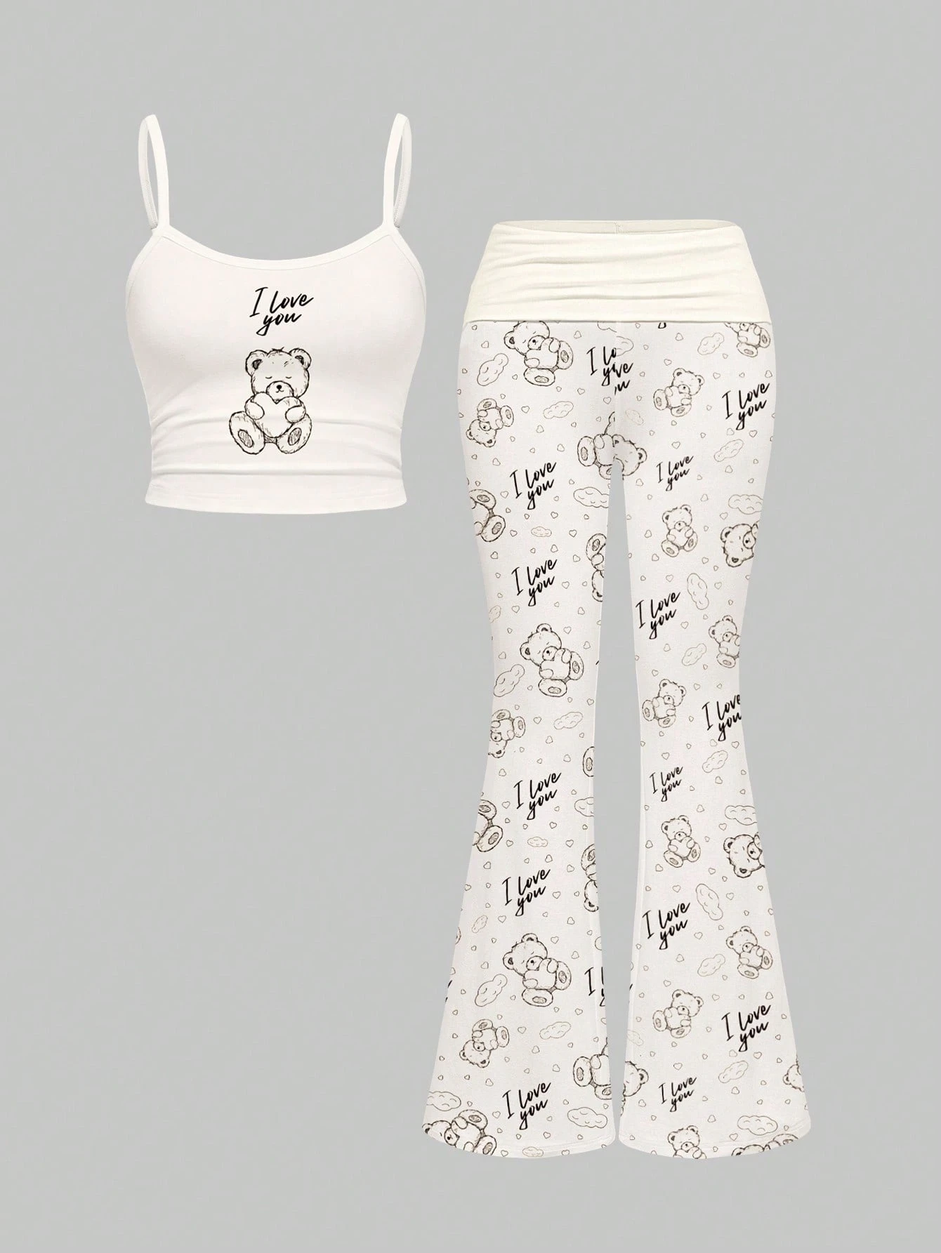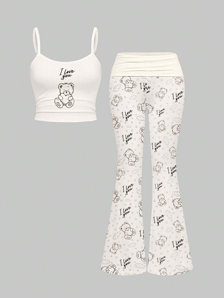 Set de 2 piezas de camiseta sin mangas y pantalones acampanados con diseño de oso, corazón y nube, estilo kawaii y sexy para mujer