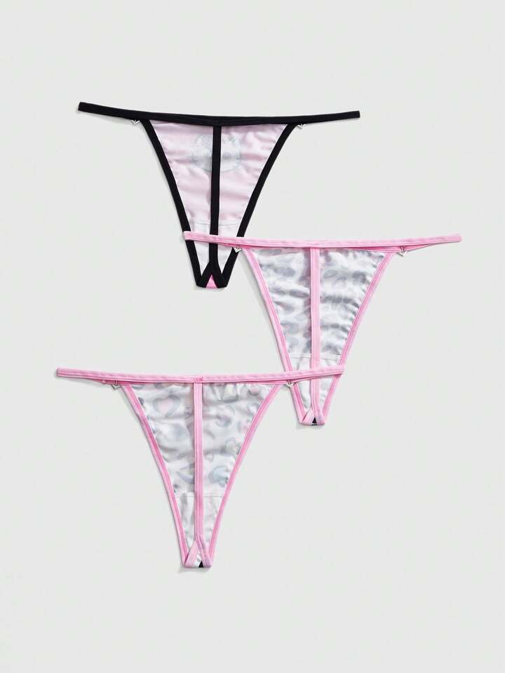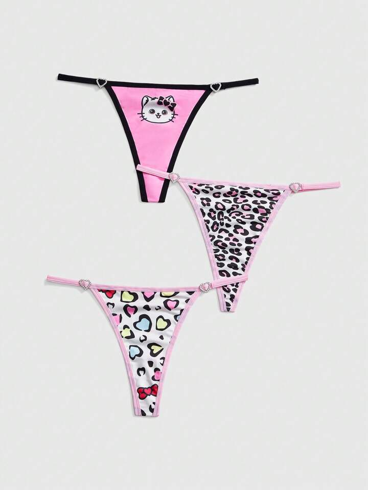 paquete de 3 tangas de mujer con decoración de corazones de cristal y estampado de leopardo y gatitos estilo Kawaii