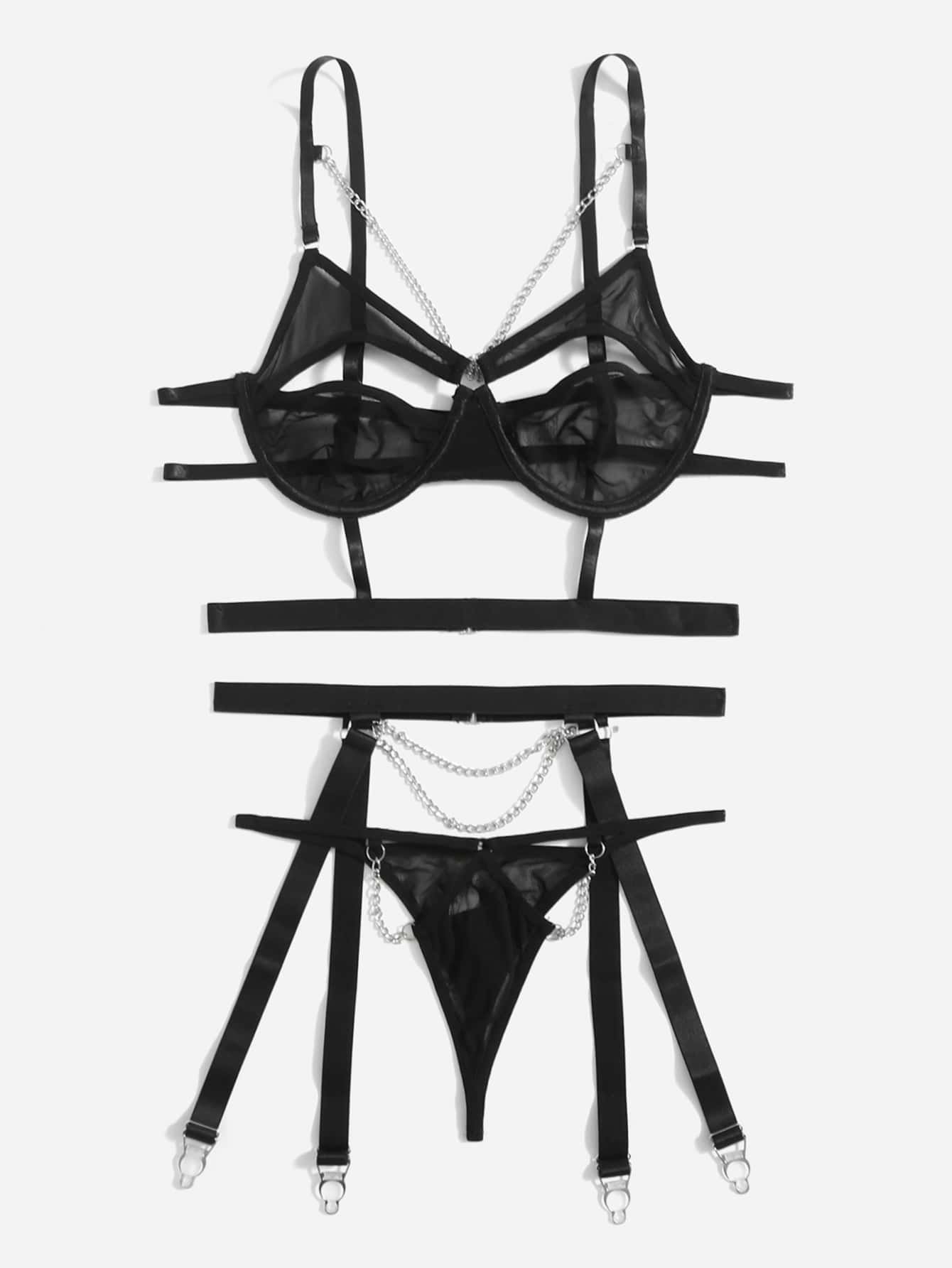 3 piezas Set de lencería de malla en contraste con abertura con diseño de cadena con liga