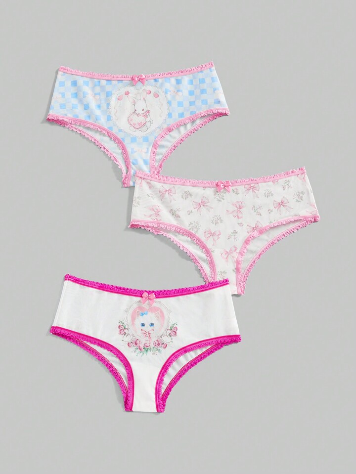 Set de 3 prendas de ropa interior con estampados de cuadrículas a cuadros, lazo, gatos, flores y corazones con motivos kawaii