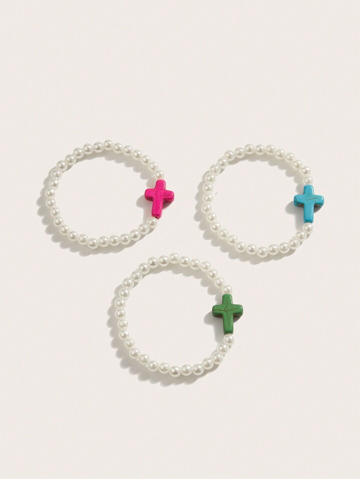 Juego De 3 Brazaletes Simples Con Cuentas De Perlas Y Cruces