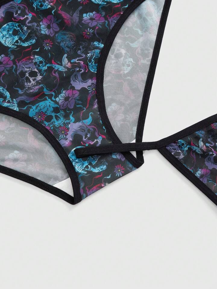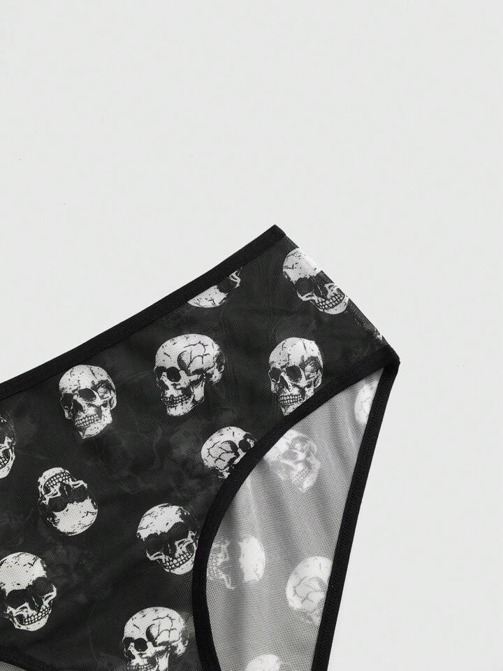 Goth Set de 4 piezas de braguitas y tangas asimétricas con diseño de calavera gótica y flores en malla