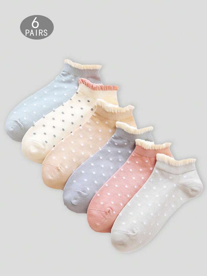 6 pares de calcetines cortos casuales de mujer con lunares y volantes en el bajo, calcetines deportivos versátiles y de moda para primavera y otoño